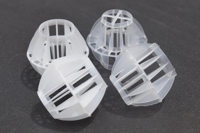多面空心球中間鏤空結(jié)構(gòu)形成空隙大,不易被阻塞的特性。這種結(jié)構(gòu)在空氣洗滌、廢氣吸收、灰塵過濾等廢氣處理工程方面應(yīng)用,具有處理風(fēng)量大、阻力小的特點。由于多面空心球的空隙中有較高的滯液量,可使塔內(nèi)液體停留時間長,從而增加了氣體與液體的接觸面積和接觸時間,便廢氣得到充分吸收處理。